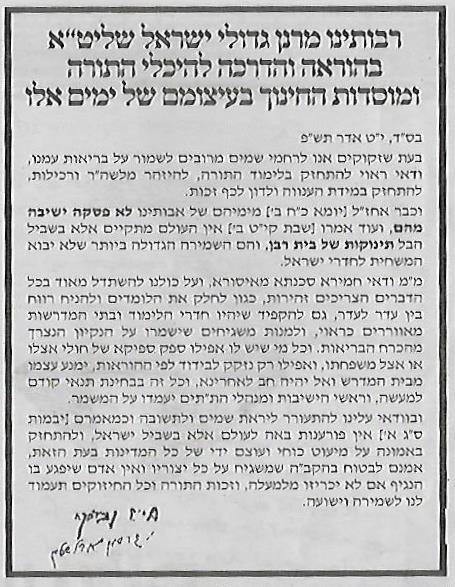 Nonetheless, danger is more serious than prohibition, and we all must try very hard in all things that require caution, such as breaking up the [groups of] learners and leaving room between each group. One should also insist that the learning classrooms and the botei medrash be properly ventilated, and to appoint responsible parties to ensure the required cleanliness that concern for health requires. And any one who has even the slightest doubt of a sickness by himself or by a member of his family, and even one who must be quarantined according to the guidelines, should not go to the beis medrash lest he damage others. All these are required preconditions for doing all this, and the roshei yeshiva and principals of the talmudei Torah must be vigilant.